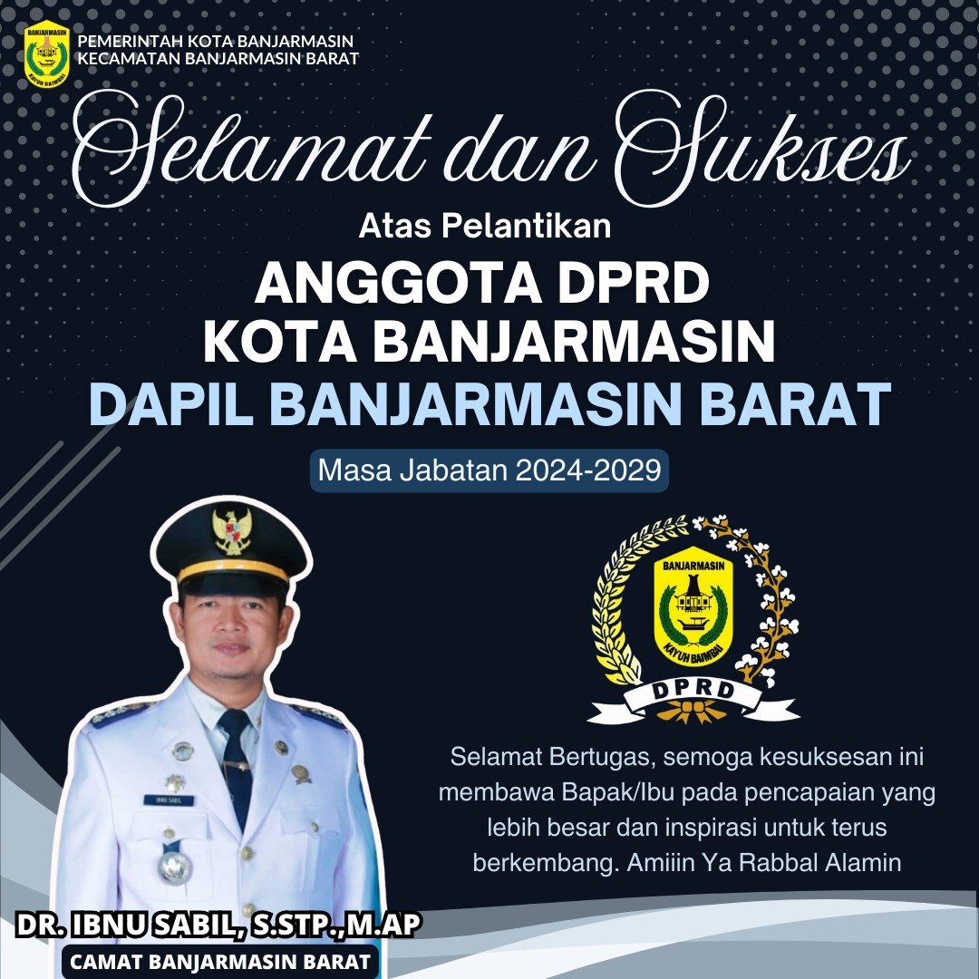 Camat Banjarmasin Barat Mengucapkan Selamat dan Sukses Atas Pelantikan Anggota DPRD Kota Banjarmasin dan Anggota DPRD Kota Banjarmasin Dapil Banjarmasin Barat Masa Jabatan 2024 - 2029.